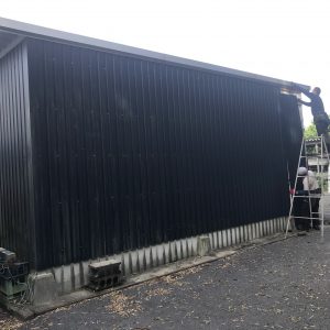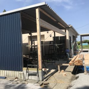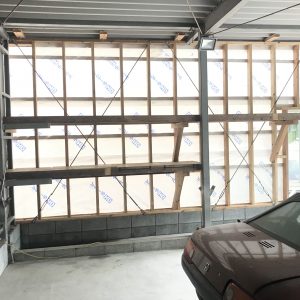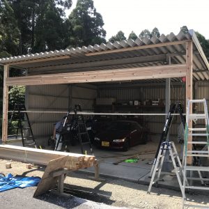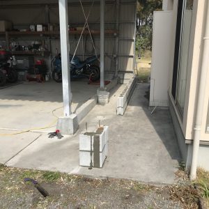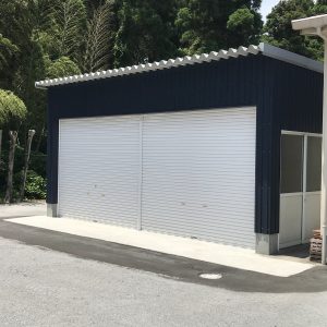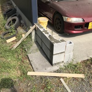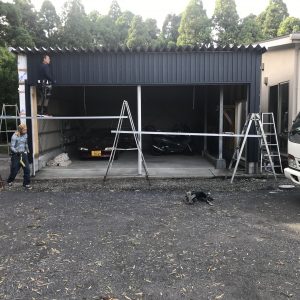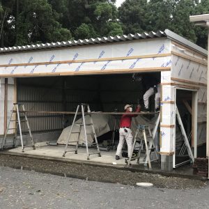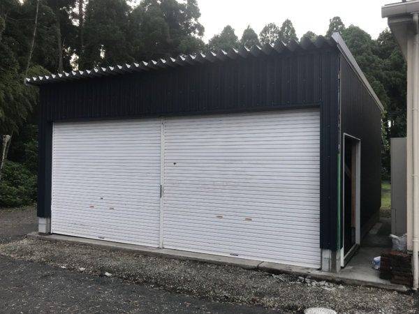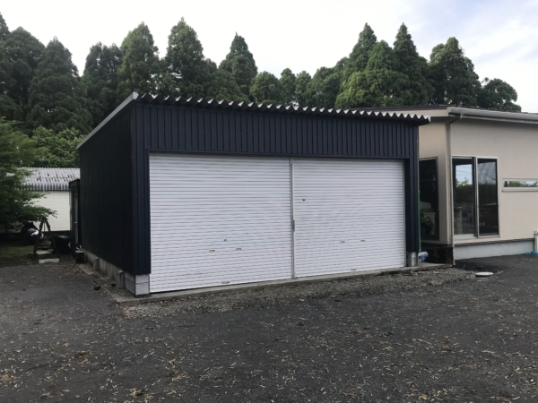 ガレージ増設 志布志市 W様邸 ㈲アキ建設 ガレージが生まれ変わりました。 工事の風景 基礎は重量ブロック12cm積み 壁下地の完了 シャッターと勝手口サッシの取付 壁角波鉄板貼り 土間延長 土間廻りをきれいに補修して完成しました。